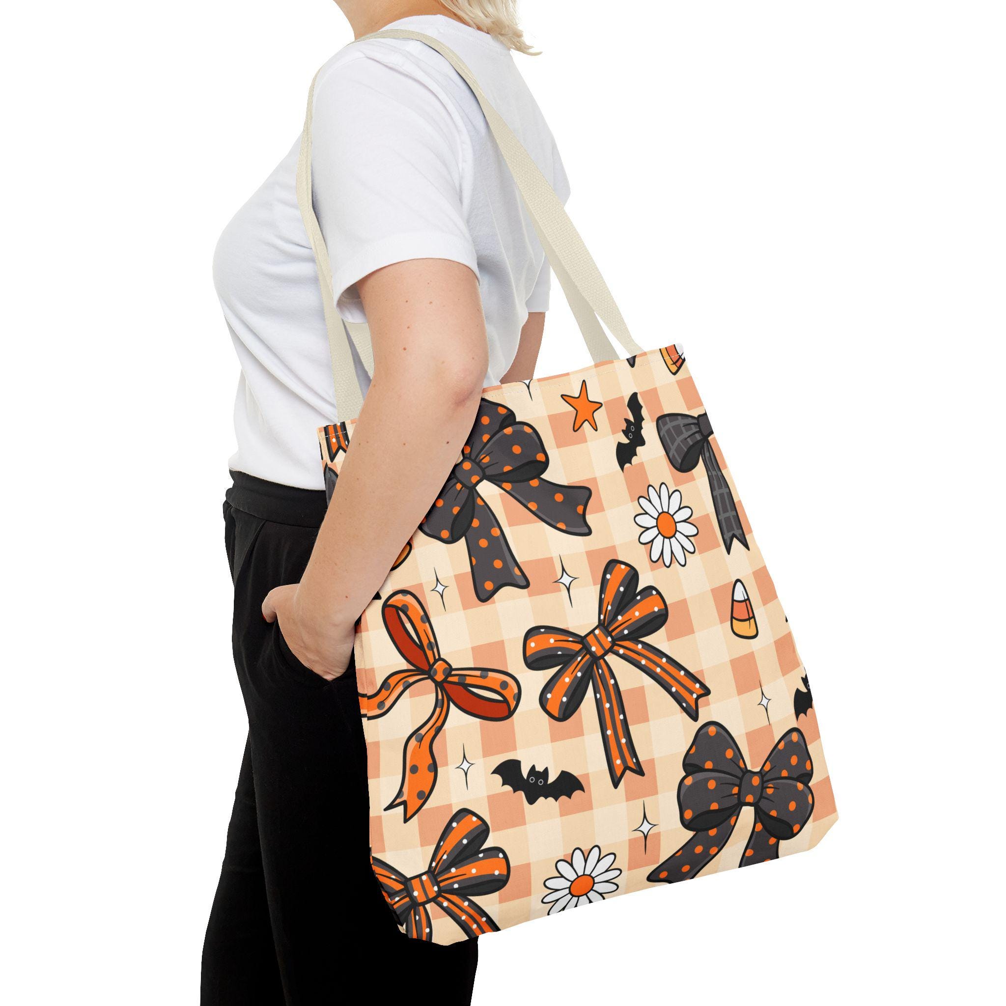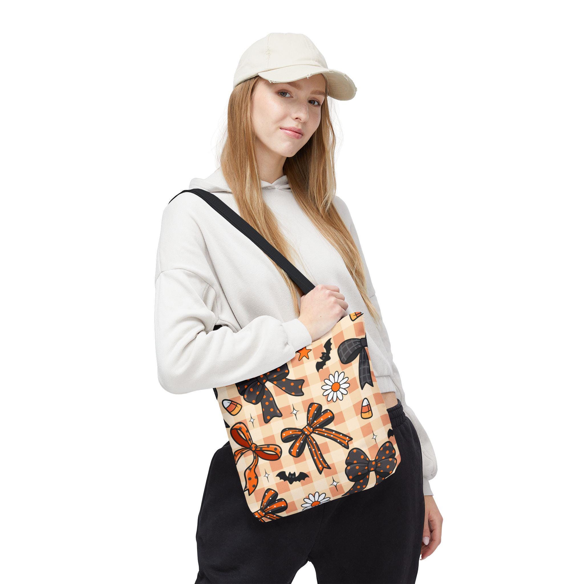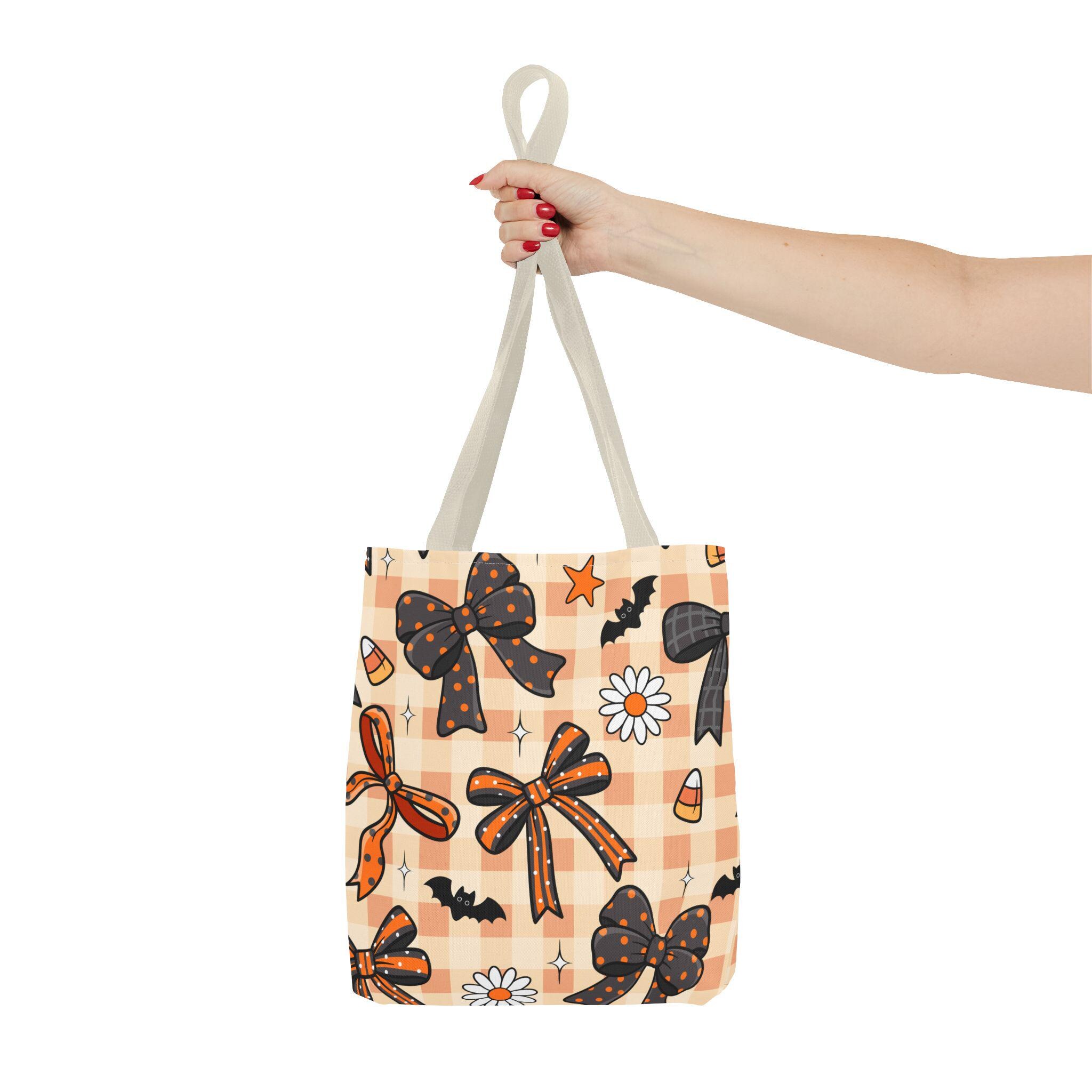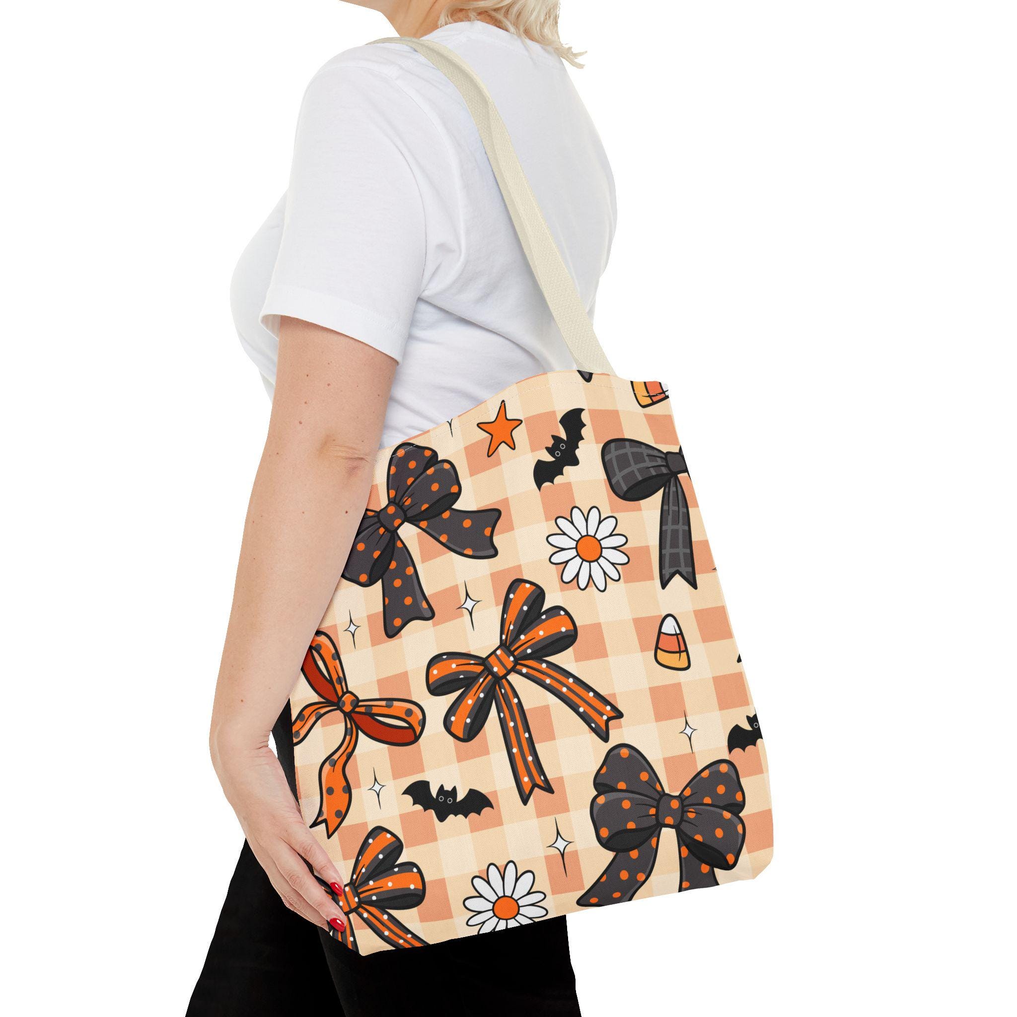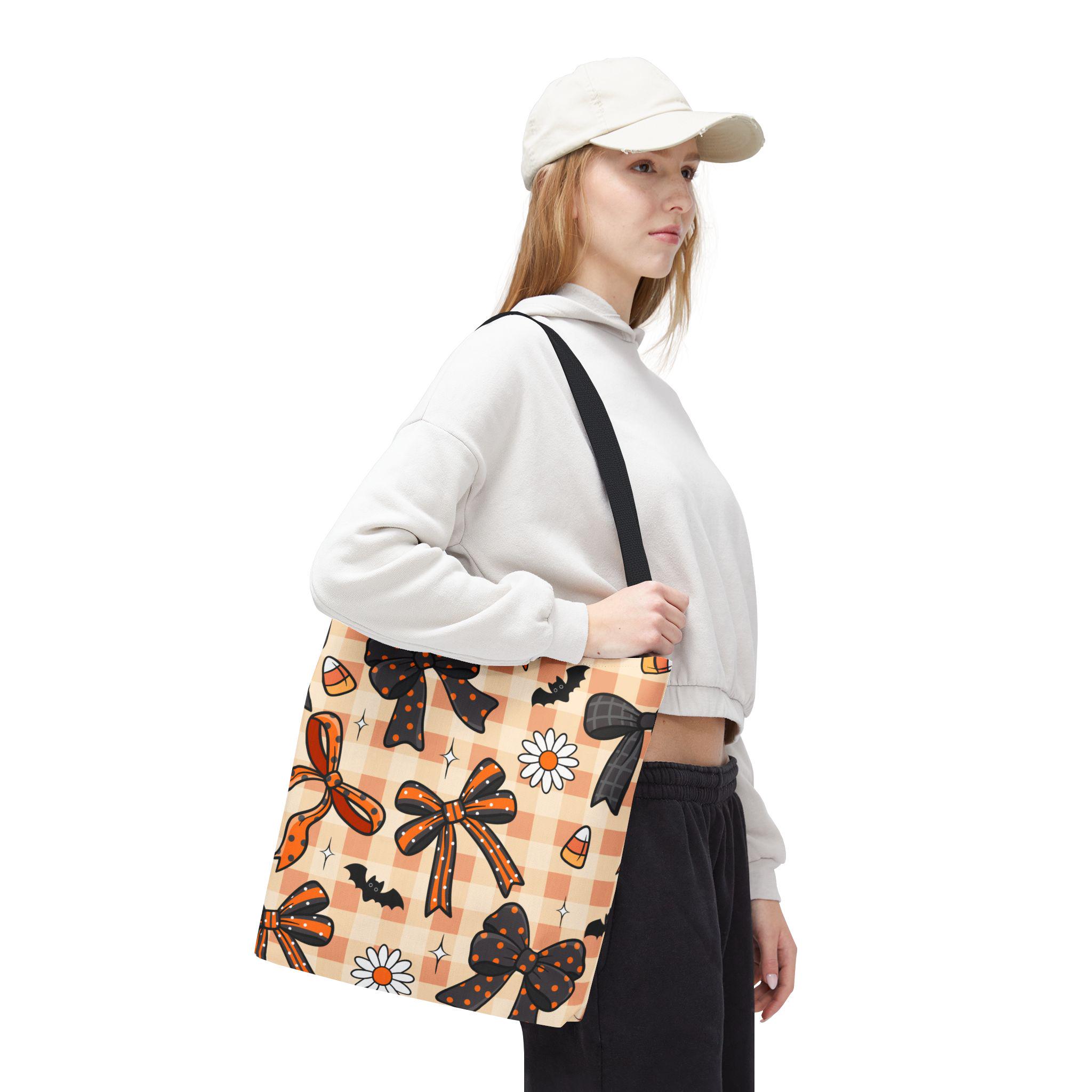 This cute Halloween Tote Bag with a plaid bow and daisy design is perfect for Fall, trick or treating, or everyday use. Made with durable 100% polyester, this bag features reinforced stitching on the handles and boxed corners for added room. Ideal for those who love Halloween and want a stylish tote for any occasion.