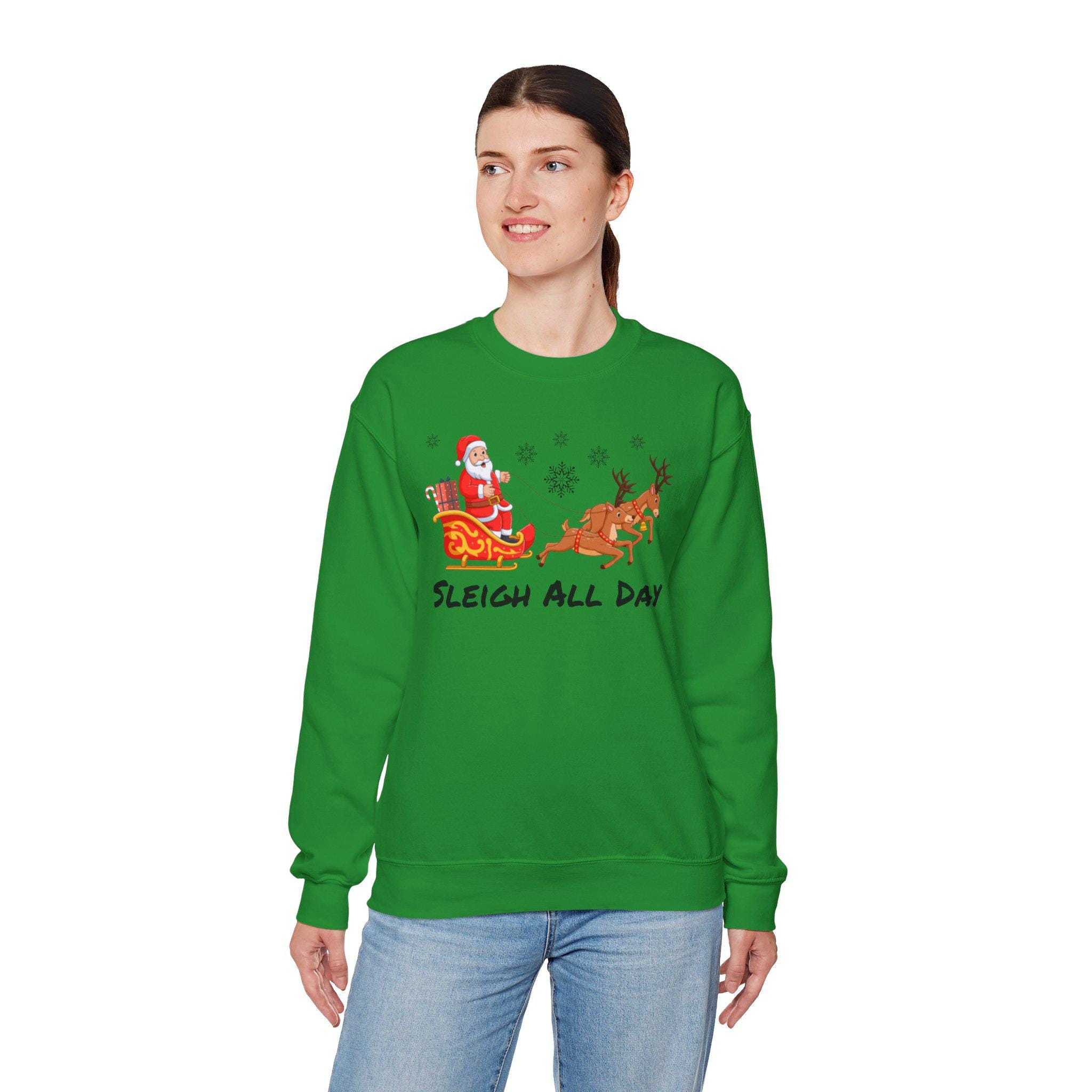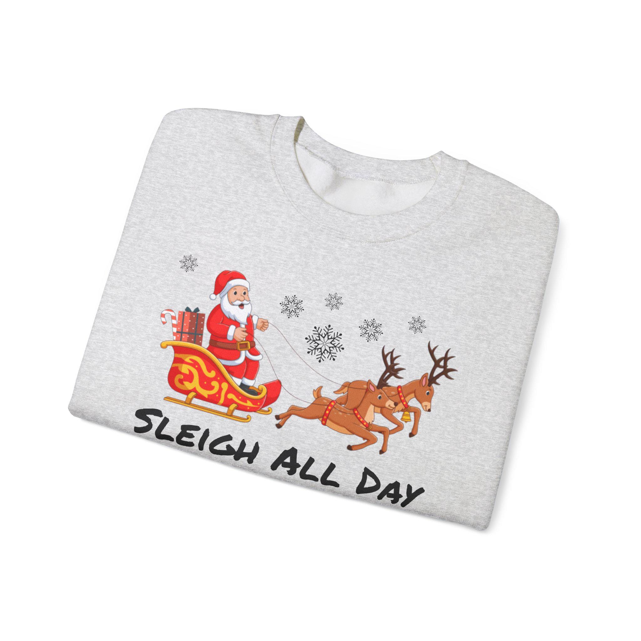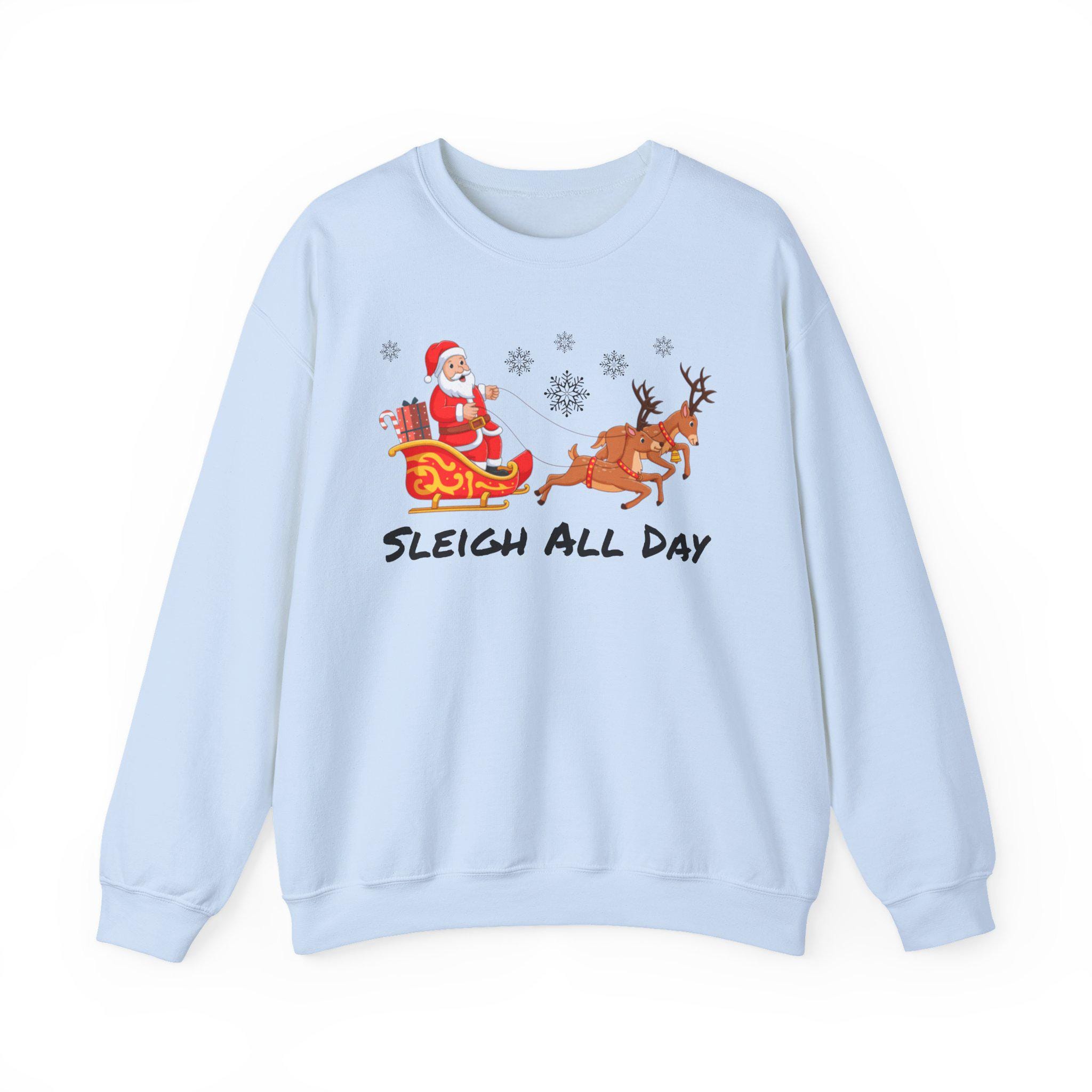 Stay cozy and festive with this Sleigh All Day Christmas Crewneck Sweatshirt. Perfect for the holiday season, this cute sweatshirt featuring Santa is a must-have for spreading Christmas cheer. Ideal for those who love the holidays and want to stay warm and stylish throughout the winter months.