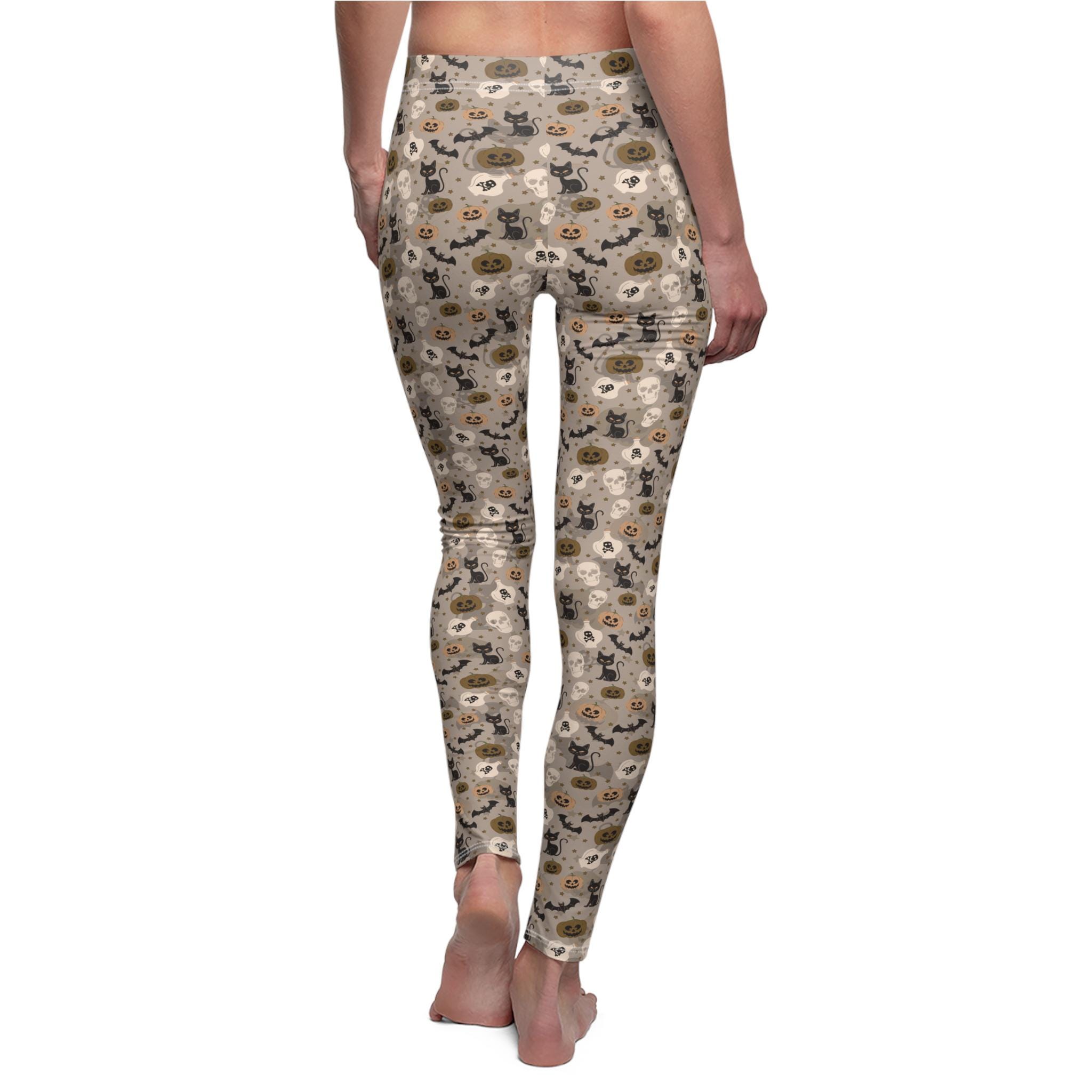 Spooky season leggings perfect for Halloween, featuring an all-over print design. Made of 95% Polyester brushed suede 5% Spandex for a smooth and stretchy fit. Ideal for women looking for a fun and festive addition to their wardrobe during the Halloween season.