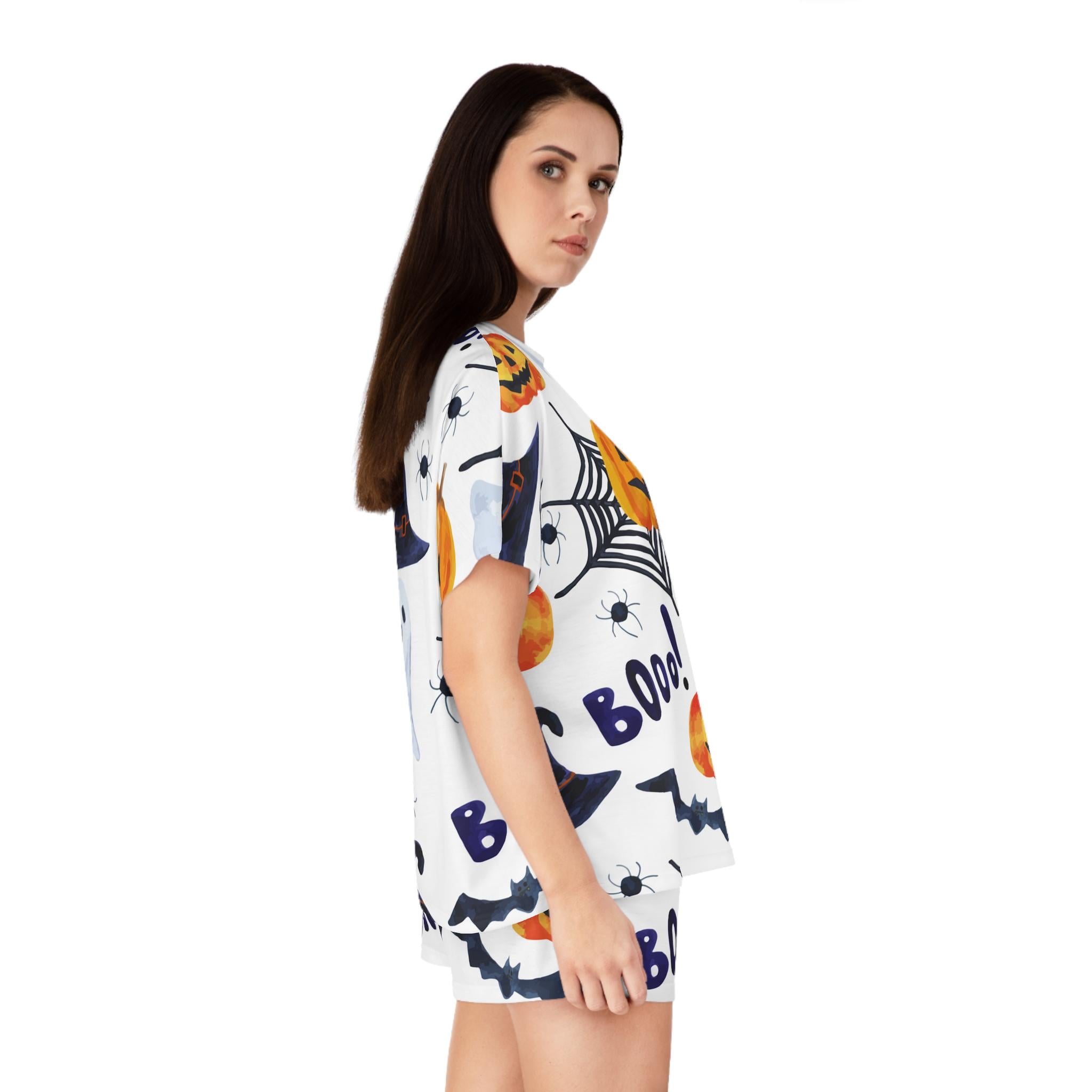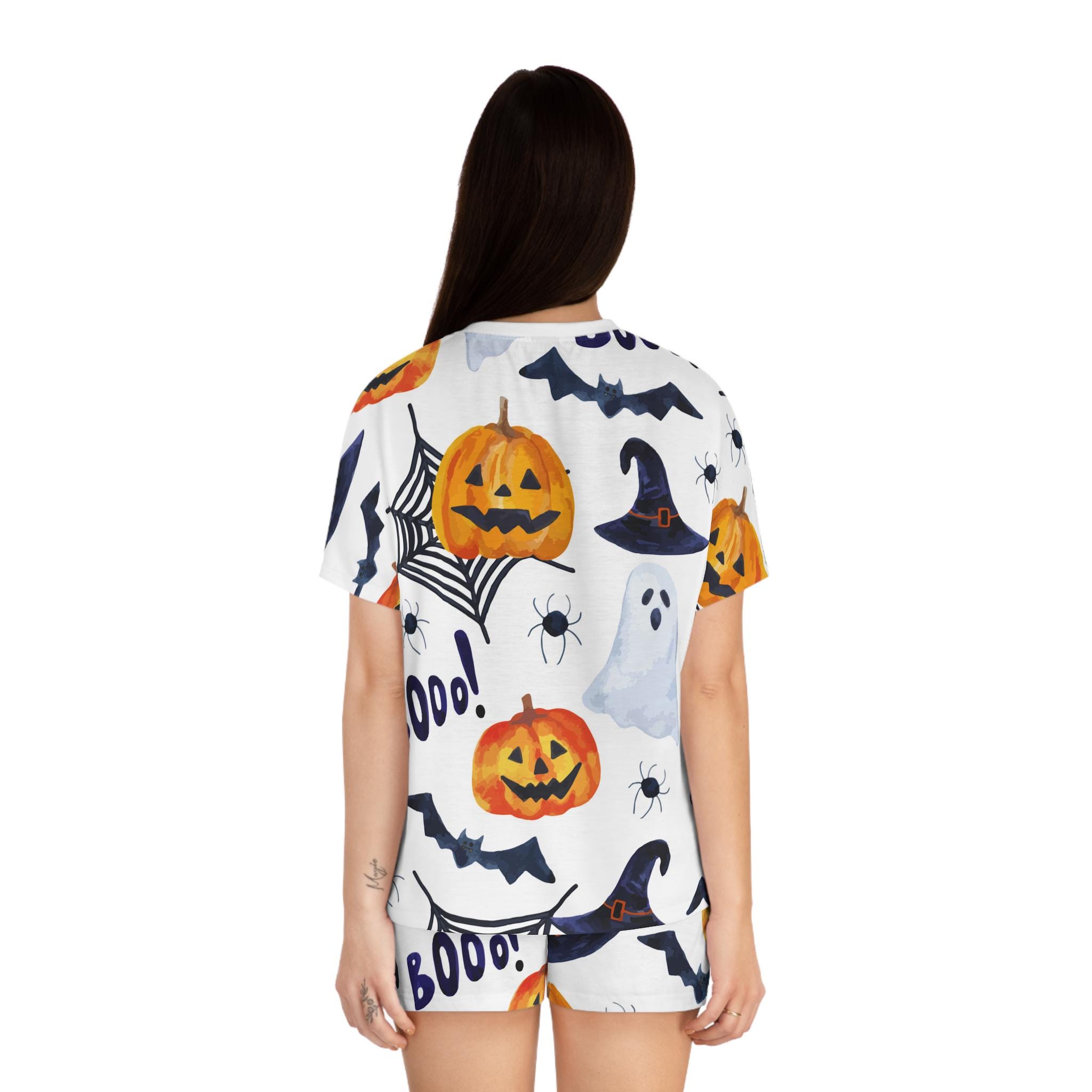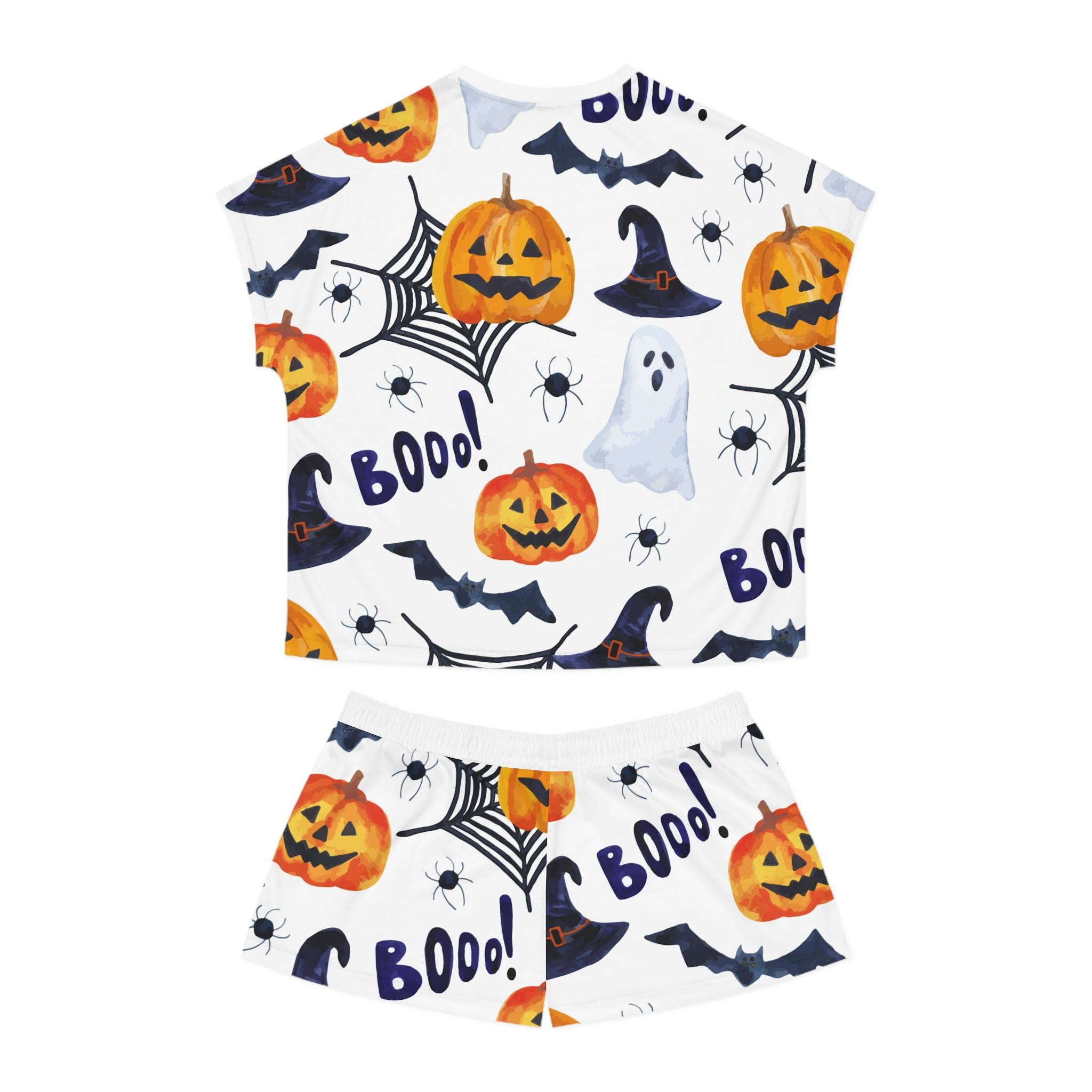 Embrace the cozy vibes with our Women's Short Pajama Set. Perfect for lazy mornings and spooky nights, this set features an adorable Halloween design of pumpkins, ghosts, and spider webs that brings a fun and festive atmosphere to your sleepwear collection. The relaxed fit and soft materials offer ultimate comfort, making it ideal for lounging at home or enjoying a movie night with friends. Tailored for those who love to celebrate Halloween or simply enjoy cute pajamas, it's a delightful addition to any wardrobe. Whether you're gifting it to a friend or treating yourself, this pajama set is perfect for Halloween parties, cozy nights in, or as a playful outfit for sleepovers.