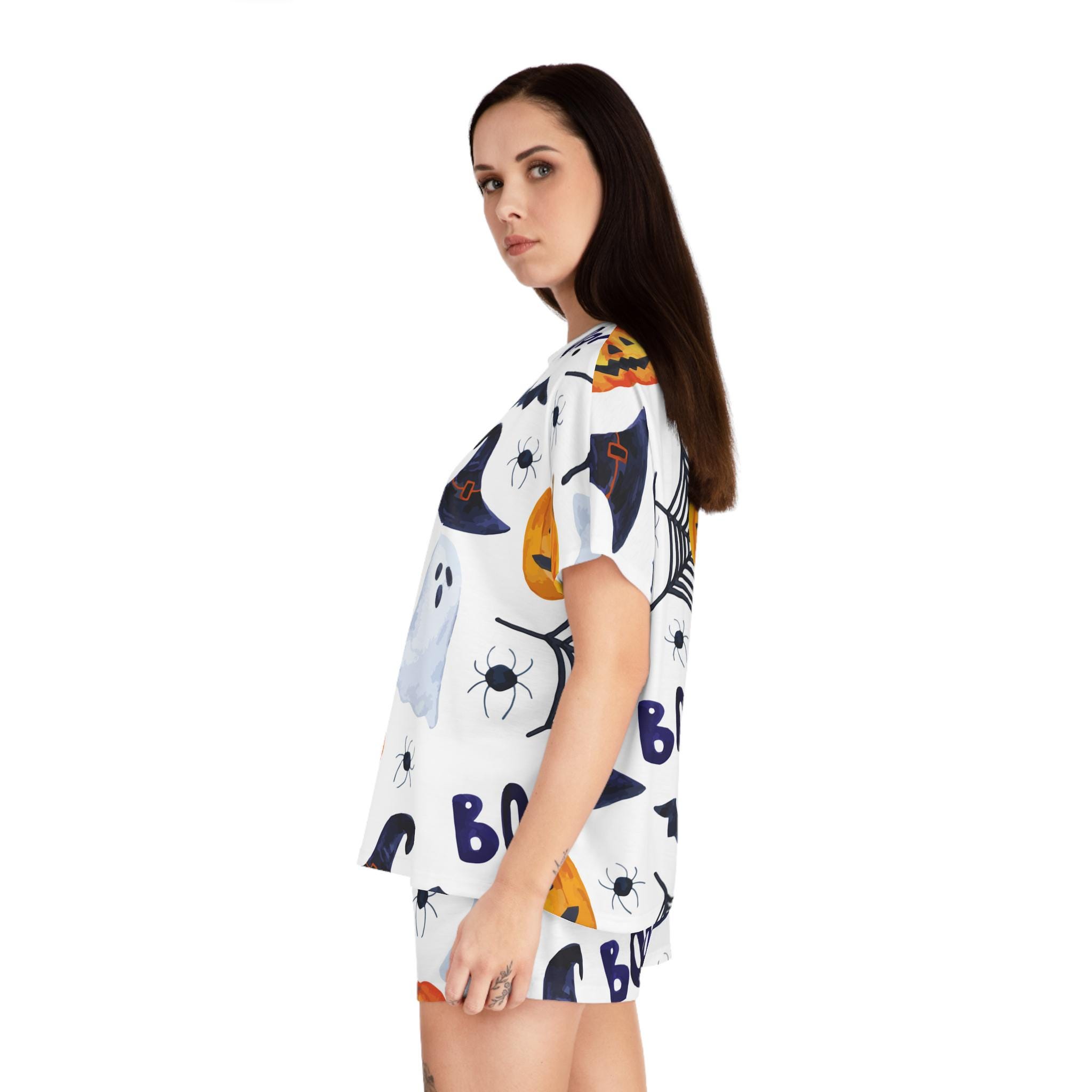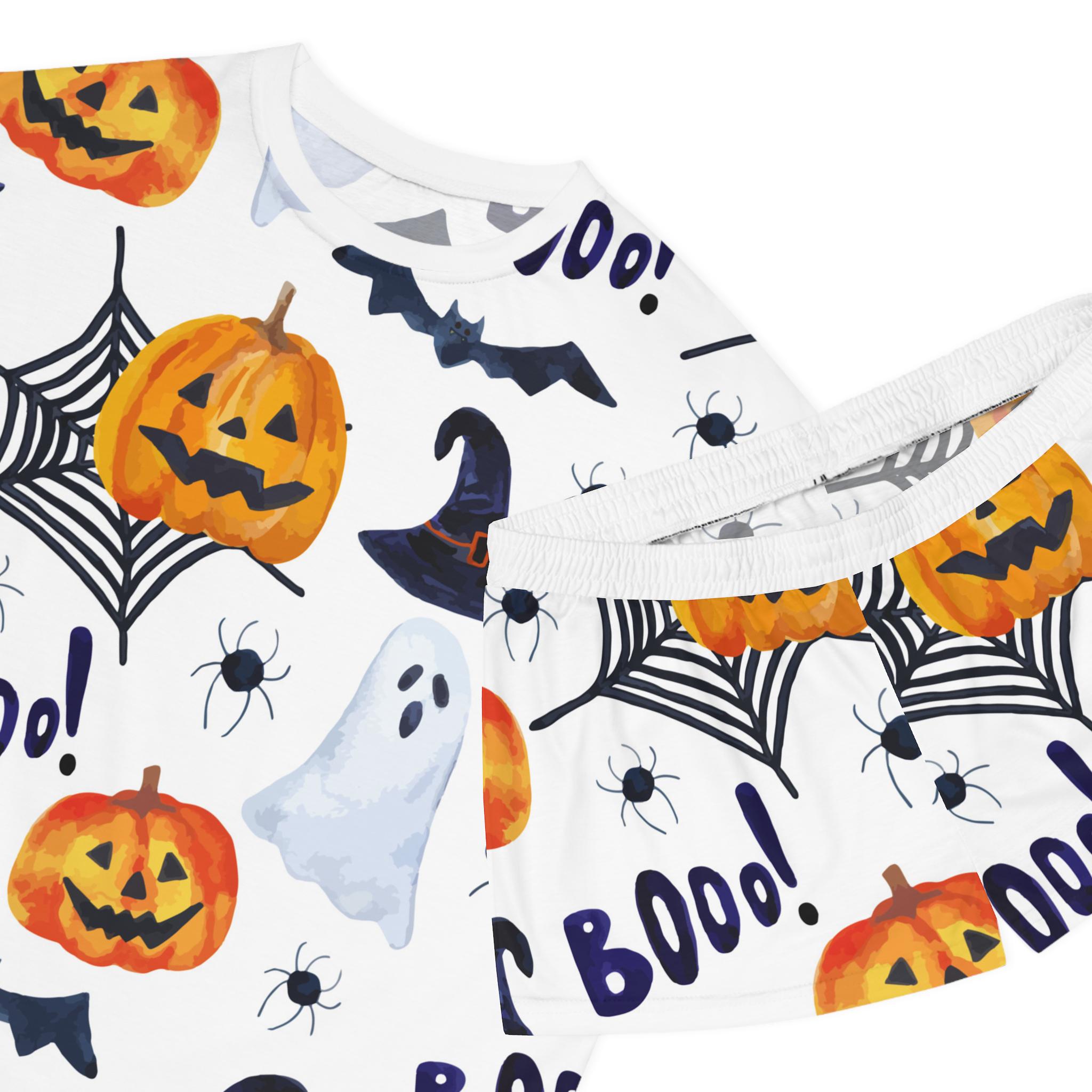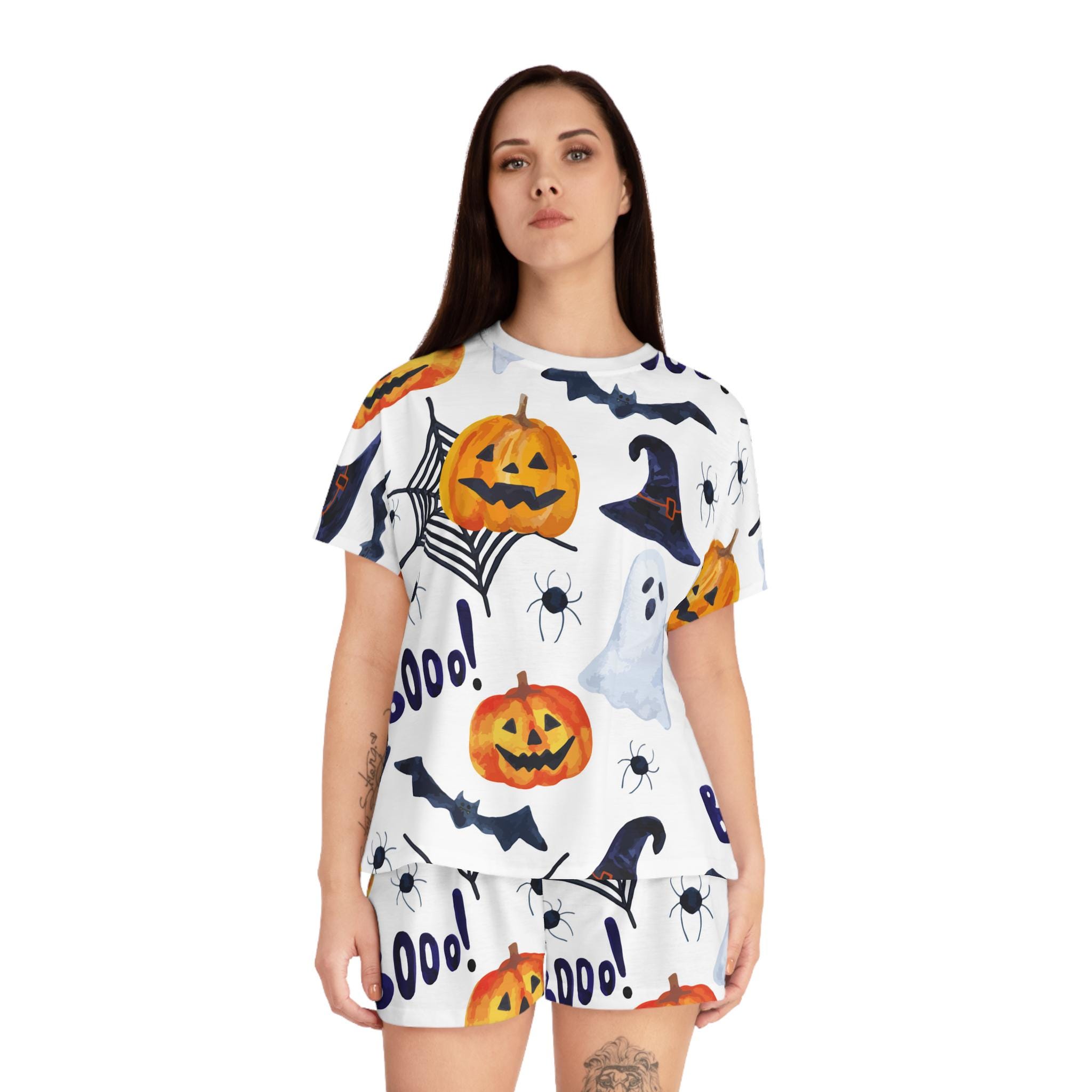 Embrace the cozy vibes with our Women's Short Pajama Set. Perfect for lazy mornings and spooky nights, this set features an adorable Halloween design of pumpkins, ghosts, and spider webs that brings a fun and festive atmosphere to your sleepwear collection. The relaxed fit and soft materials offer ultimate comfort, making it ideal for lounging at home or enjoying a movie night with friends. Tailored for those who love to celebrate Halloween or simply enjoy cute pajamas, it's a delightful addition to any wardrobe. Whether you're gifting it to a friend or treating yourself, this pajama set is perfect for Halloween parties, cozy nights in, or as a playful outfit for sleepovers.