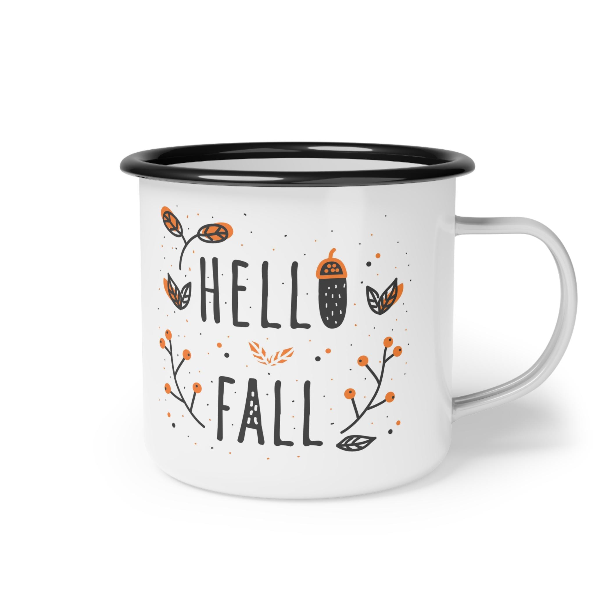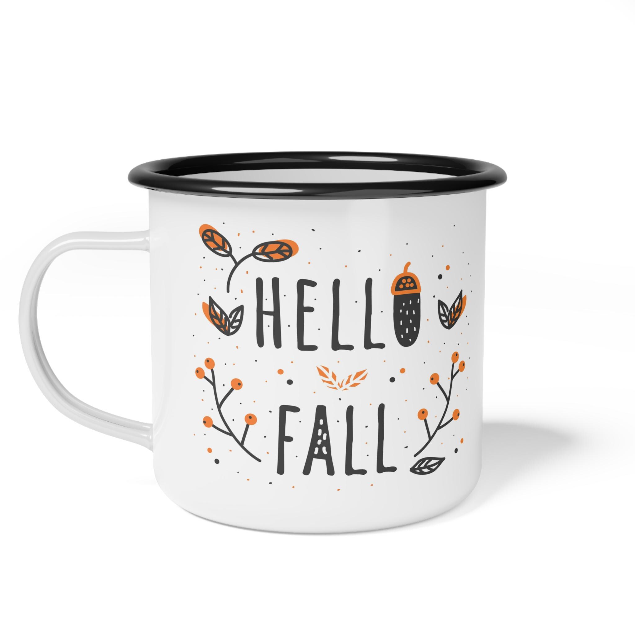 This enamel camp mug is perfect for the Fall season, featuring a 'hello Fall' design for coffee or soup lovers. It gives a cozy and warm vibe, making it a great addition to your Fall decor. Ideal for those who enjoy the crisp air and changing leaves of Fall, this mug is perfect for sipping warm beverages by the bonfire or on a chilly morning. A thoughtful gift for Fall birthdays, Thanksgiving, or as a treat for yourself.