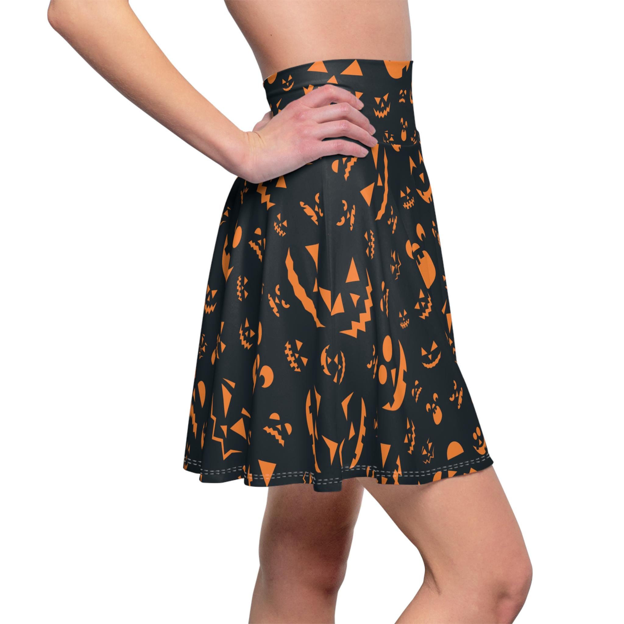 This Halloween pumpkin skater skirt is perfect for those wanting to add a festive touch to their wardrobe. The jack-o'-lantern design gives off a fun and playful vibe, making it ideal for Halloween parties or trick-or-treating fun. It's relevant to women who love unique and quirky fashion pieces, and it's a great way to celebrate the spooky season.