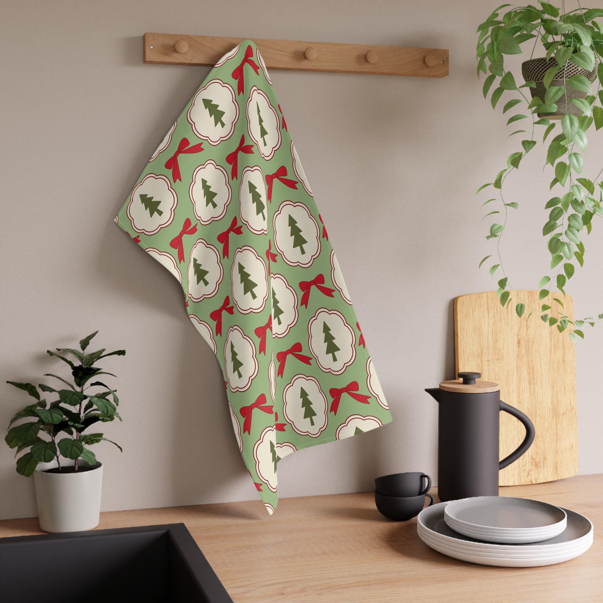 Bring a festive touch to your kitchen with these charming tea towels. Designed with a vibrant holiday pattern featuring lush green trees and cheerful red bows, these towels will brighten up your space and add a cozy atmosphere to your holiday cooking and baking. Perfect for anyone who loves to entertain, this product makes an excellent gift for friends and family during the winter season. Ideal for Christmas gatherings, housewarming parties, or simply to elevate your everyday kitchen decor, these tea towels are both functional and stylish. They are perfect for anyone looking to infuse their home with a bit of holiday cheer!