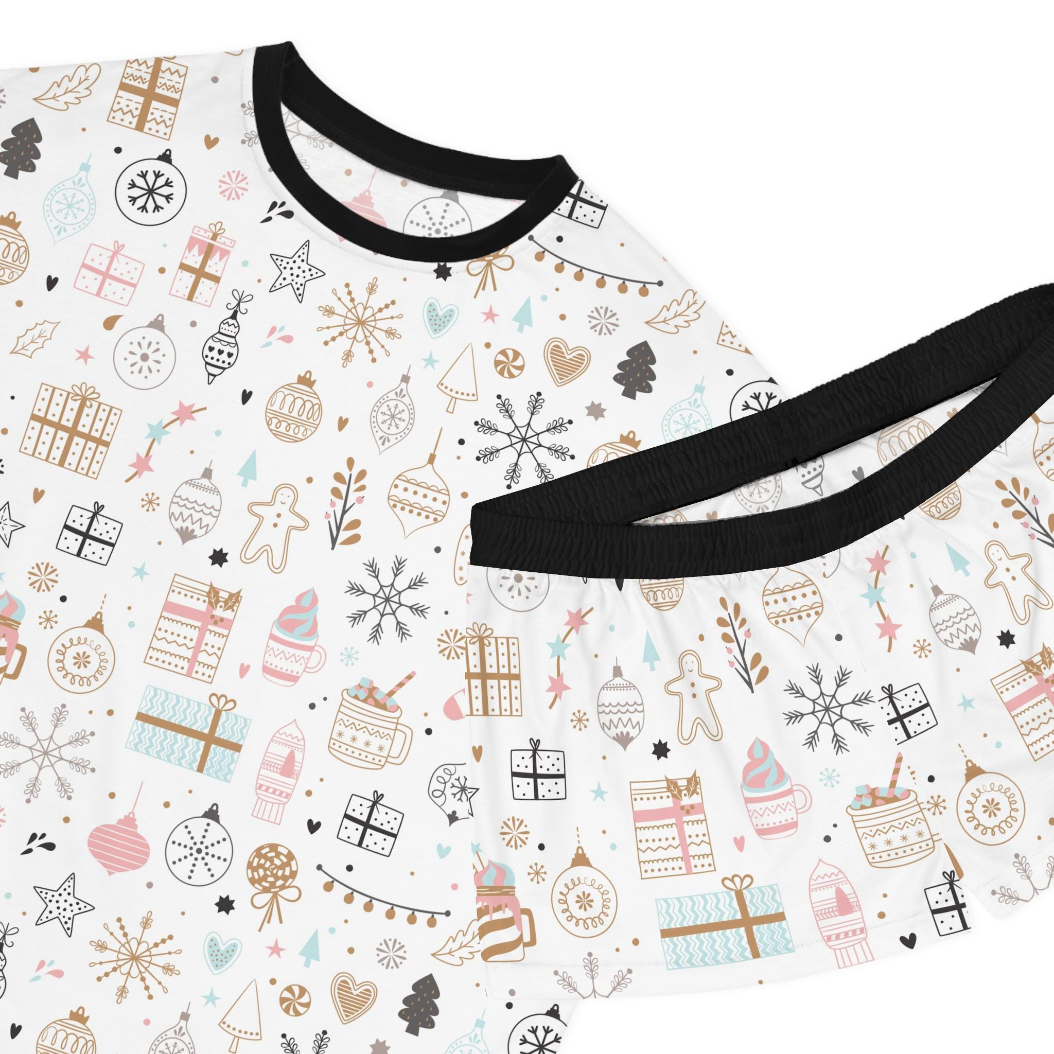 This cozy winter-themed pajama set is perfect for snuggling up with a hot cocoa by the fireplace. Featuring gingerbread and presents designs, it gives off a festive and comfortable vibe. Ideal for women looking to stay warm and stylish during the holiday season.
