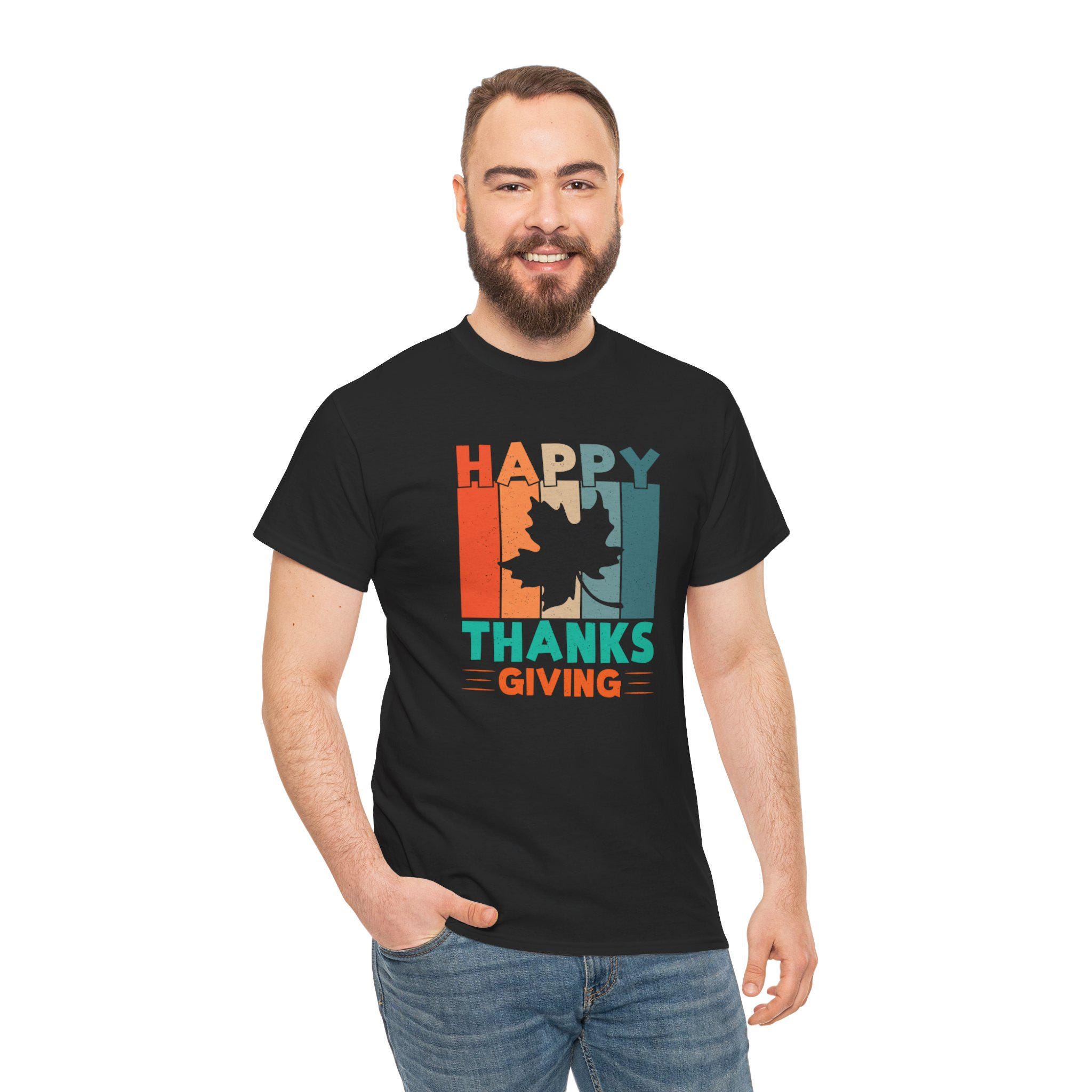 Celebrate Thanksgiving in style with this Happy Thanksgiving men's tee. Made from strong and smooth fabric perfect for printing, this tee features a ribbed knit collar without seam for shape retention. Perfect for a comfy, relaxed fit for any occasion.