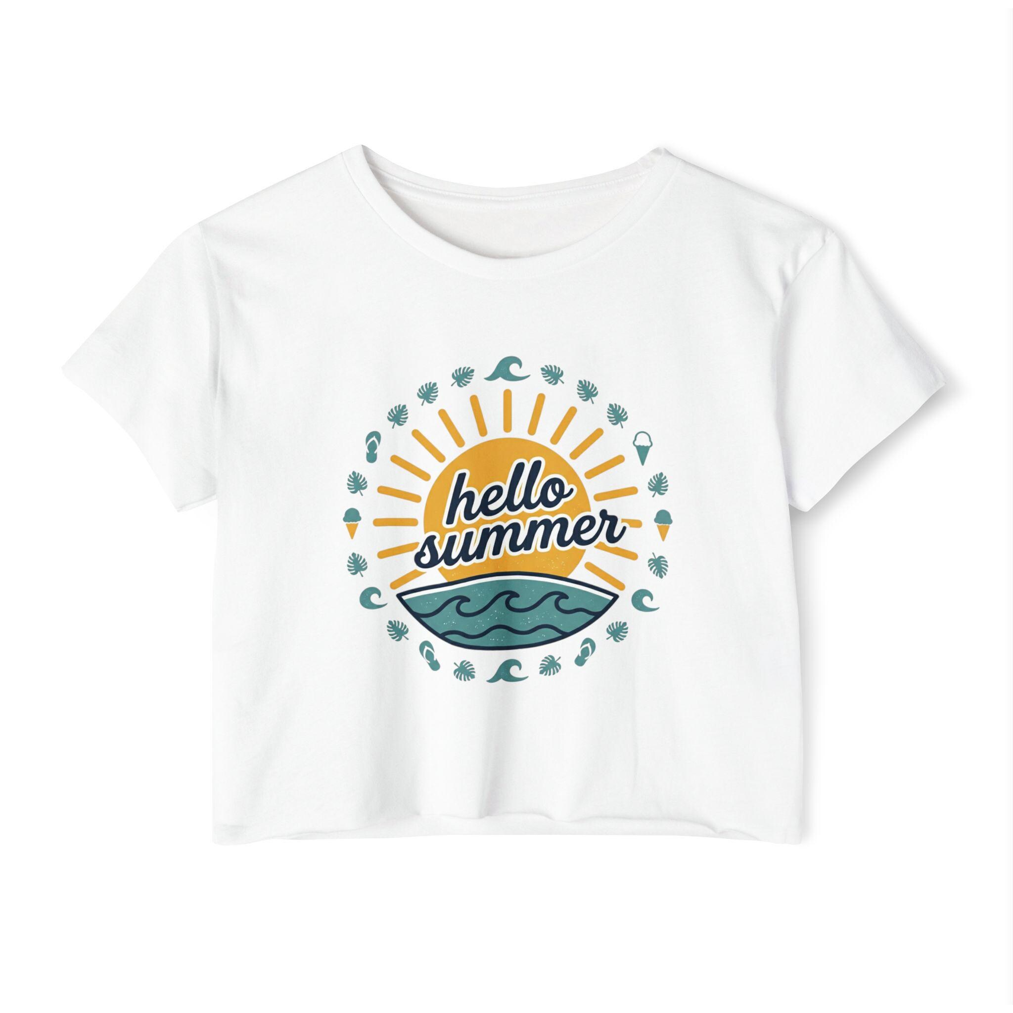 Light, breezy, and made for sunlit days — this cropped top carries a retro surf-summer vibe that slips easily into a festival lineup or a weekend by the beach. The scoop neck and relaxed, modest cut frame movement without feeling tight. Raw sleeve and bottom hems give it a casual, handmade finish that plays well with high-waisted denim, flowy skirts, or layered over a bralette. The cheerful “hello summer” artwork sits centered to catch eyes and set a playful tone for warm-weather plans. Breathable, extra-light fabric keeps you cool during long outdoor hours, and the tear-away label keeps the back smooth under straps or jewelry.